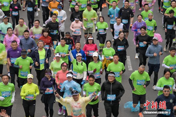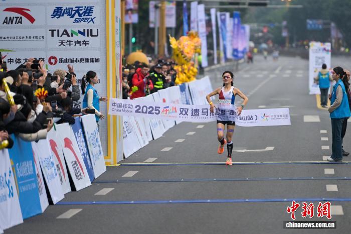 图为齐程马推紧男子组王巧霞冲过尽头,并以2小时45分29秒成就取得第别名。中新社记者 刘忠俏 摄